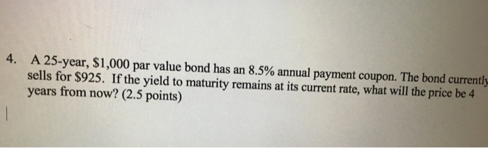 A 25 Year 1000 Par Value Bond Has An 85 Annual Payment Coupon The