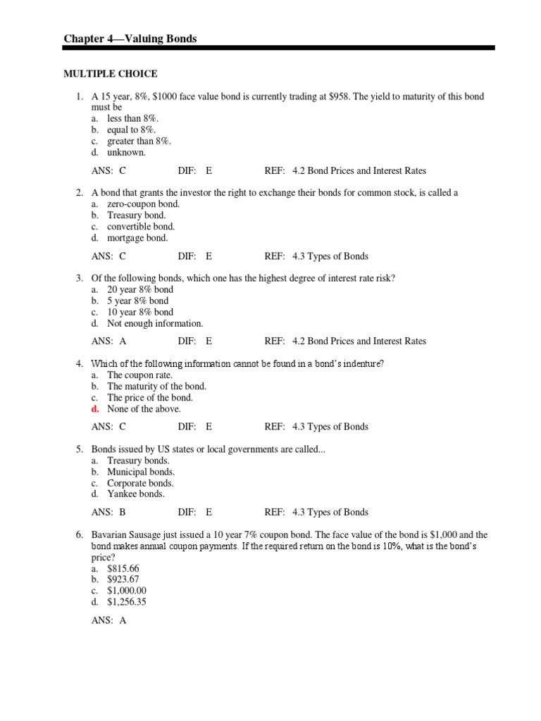 Finance First Part Quiz Chapter Four Yield Curve Bonds Finance
