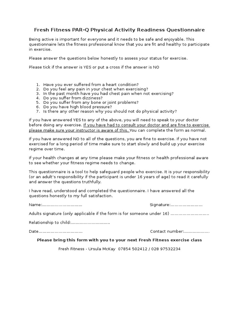 Provide details such as duration and beginning and ending heart rate. The par q is a voluntary self appraisal and not a medical check up clearance and should not have any implications on ntu and her staff. Many health clubs gyms and other physical activity providers use a questionnaire methodology. Find out why this is so important the questions you should be asking and how to meet all your obligations.