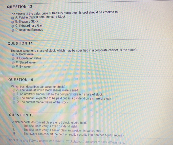 Solved Question 13 The Excess Of The Sales Price Of Treas Chegg Com