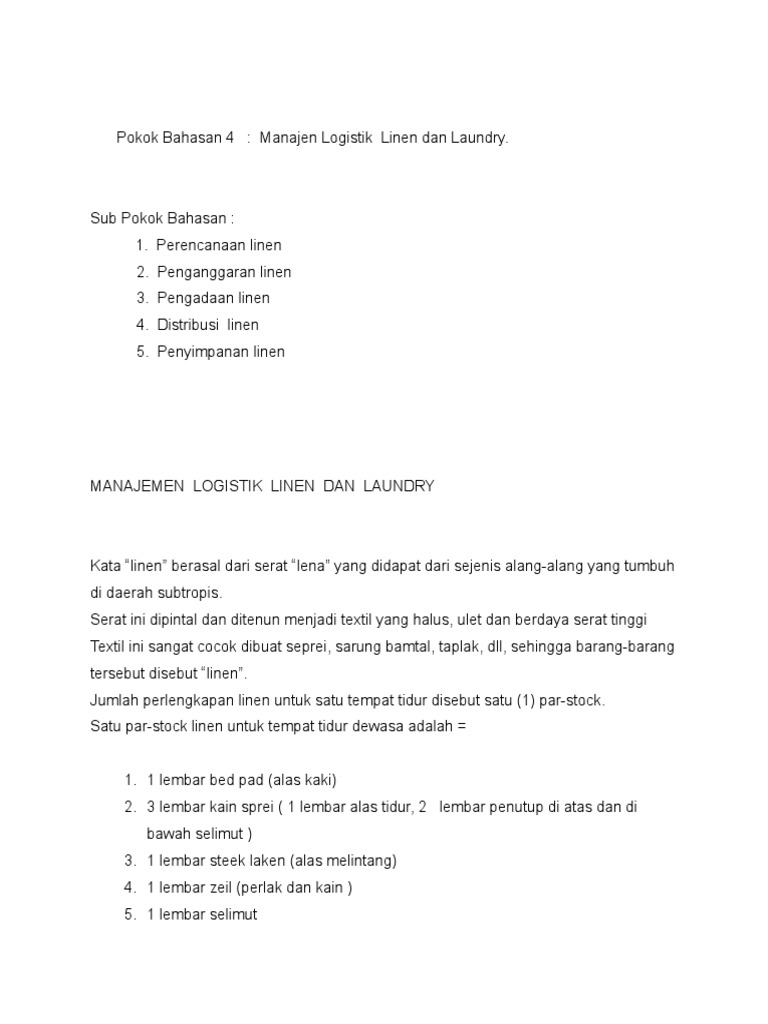 Lost and found section is a small area separately or may be included within the desk control section equipped with cupboard or lockers to store guest articles that are lost and found which may claimed later. Linen adalah jenis benang atau kain yang terbuat dari serat serat batang rami halus flax. By approaching the method of par stock the executive housekeeper can estimate the required amount of hotel linens and uniforms for a particular year. Par stock can help the executive housekeeper to make best possible use of hotel budgeting.