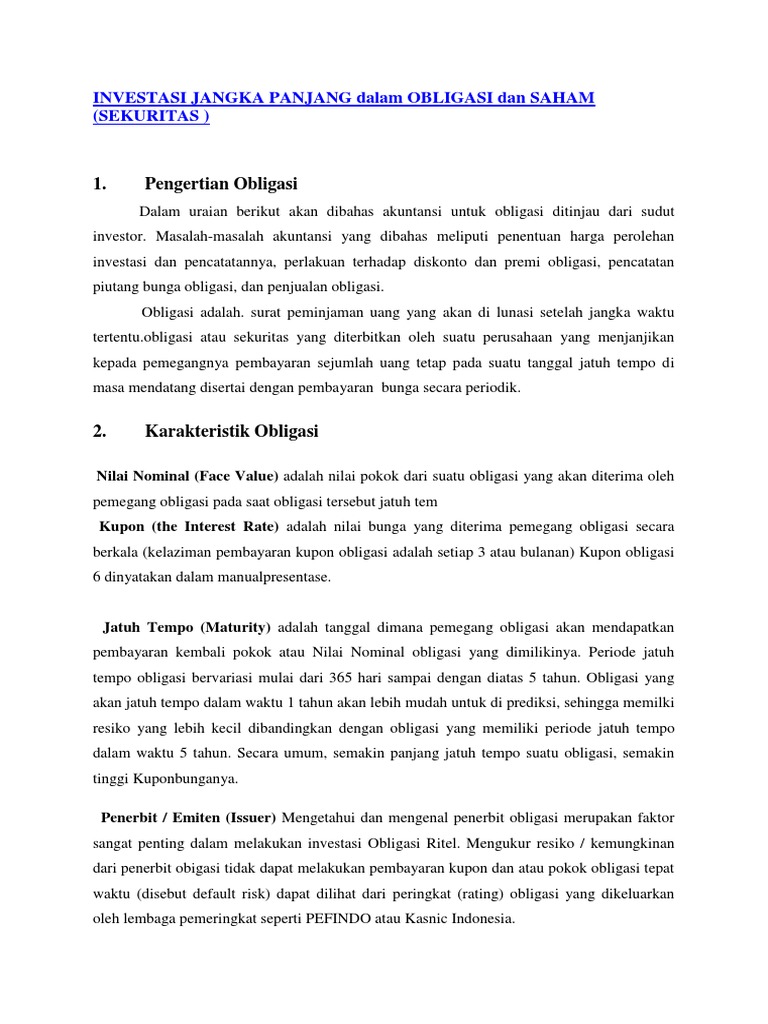 Contohnya 10 tahun obligasi at t memberikan hak untuk menerima pembayaran kupon atau bunga secara periodik dan pokok atau face value pada saat jatuh tempo. Untuk saham tanpa nilai pari mengharuskan bahwa semua bayaran yang diterima dari saham tersebut di akui sebagai modal resmi sekalipun saham itu dijual dengan harga yang berbeda beda. Obligasi adalah surat utang jangka panjang yang diterbitkan dengan nilai nominal nilai pari par value oleh suatu lembaga dengan waktu jatuh tempo tertentu penerbit obligasi bisa saja oleh perusahaan bumn perusahaan swasta atau pemerintah baik pusat maupun daerah baca juga. Sebaliknya pemegang obligasi memberikan sejumlah uang kepada perusahaan saat ini.