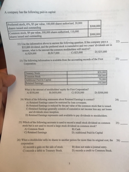 Solved A Company Has The Following Paid In Capital Prefe