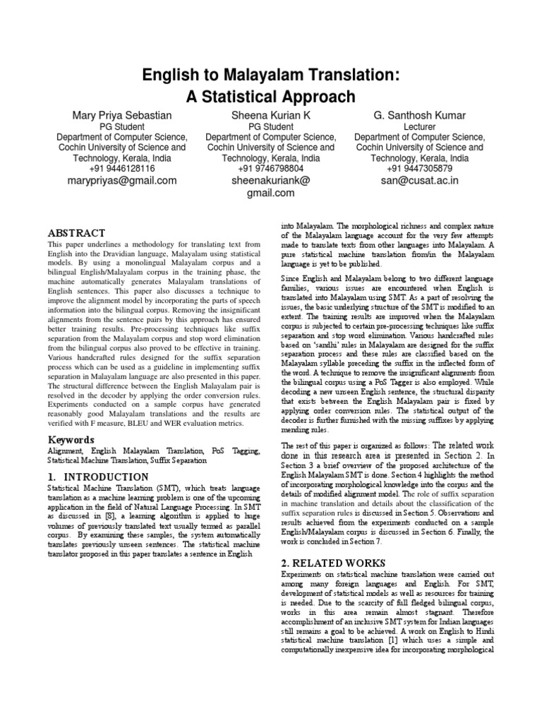 English To Malayalam Translation A Statistical Approach English
