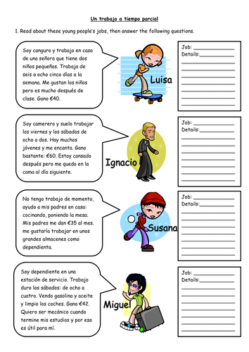 Spanish Part Time Jobs Worksheet Teaching Resources
